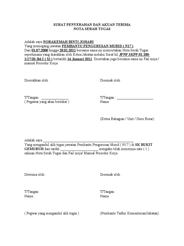 Senarai tugas jawatan ii 3. Surat serahan tugas nota serah tugas.borang kutipan dan serahan guru ke pejabat darjah. Surat tugas di buat dan di tanda tangani oleh atasan atau pejabat yang. Lampiran senarai serahan tugas bi l 1. Contoh surat tugas dalam artikel ini diantaranya adalah surat tugas organsisasi, surat perintah tugas, perjalanan dinas dan yang lainnya.